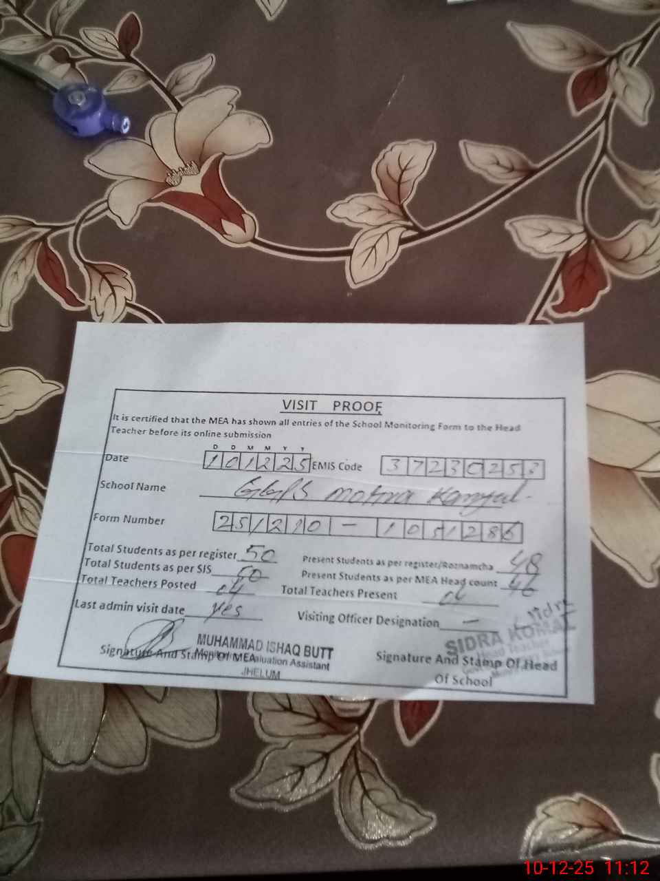 | Certified that this School was Inspected by the Undersigned MEA/DMO Today and the Information Stated Above is as Per Record. | |||||