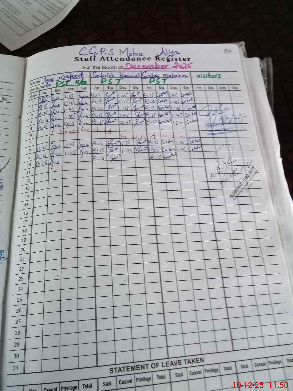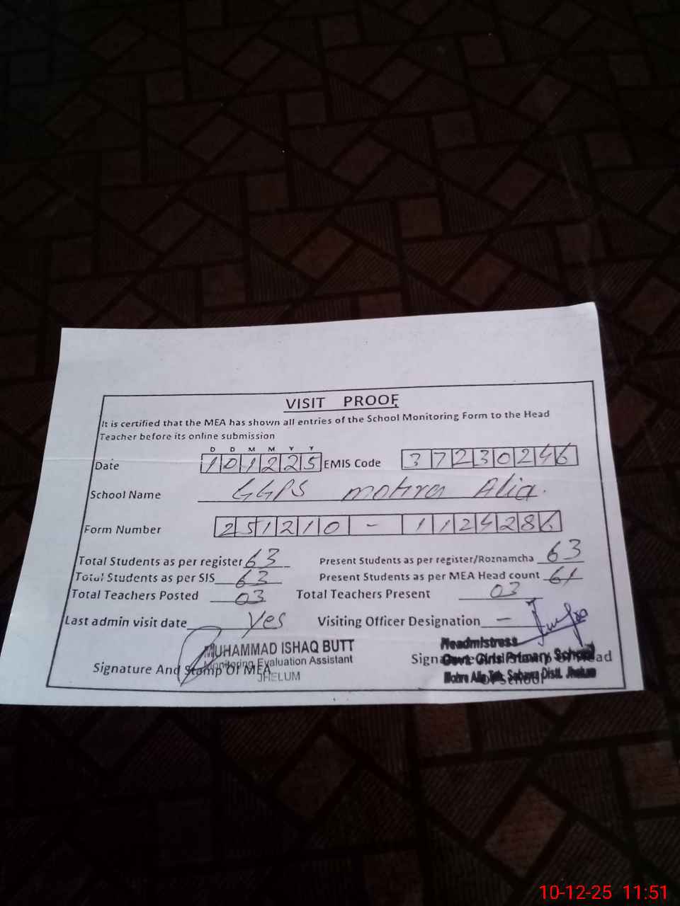 | Name: IQ**** MA**** Designation: (School Headmaster's/Headmistress's) PST Phone/Cell Number: 03**** |