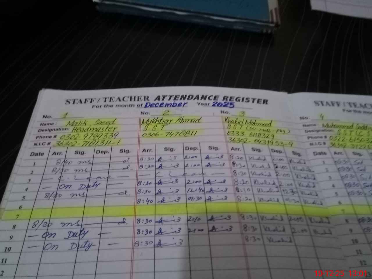 | CNIC | Full Name | Designation | R/C | Absence during last cal. month |