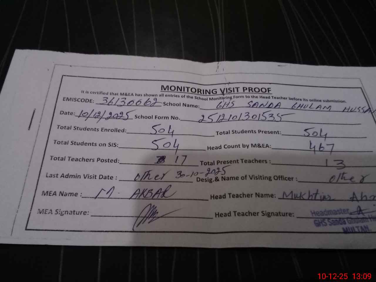 | Attendance Register | Head Teacher | MEA with School | Visit Proof |