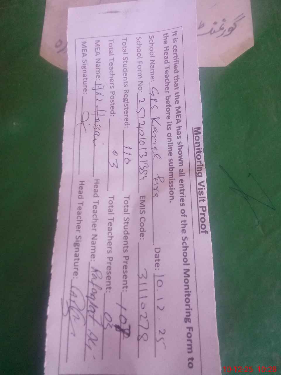| Attendance Register | Head Teacher | MEA with School | Visit Proof |