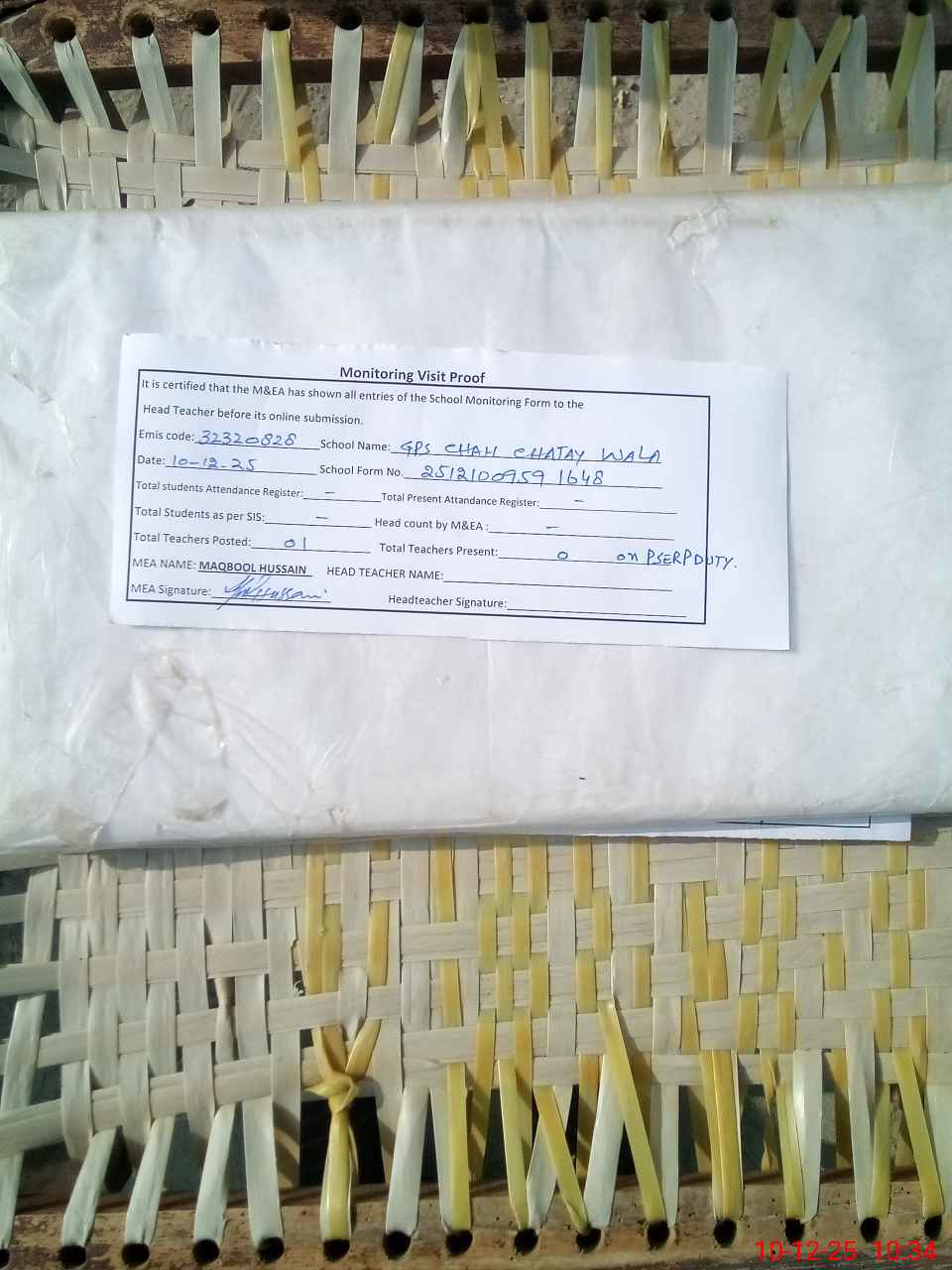 | Attendance Register | Head Teacher | MEA with School | Visit Proof |