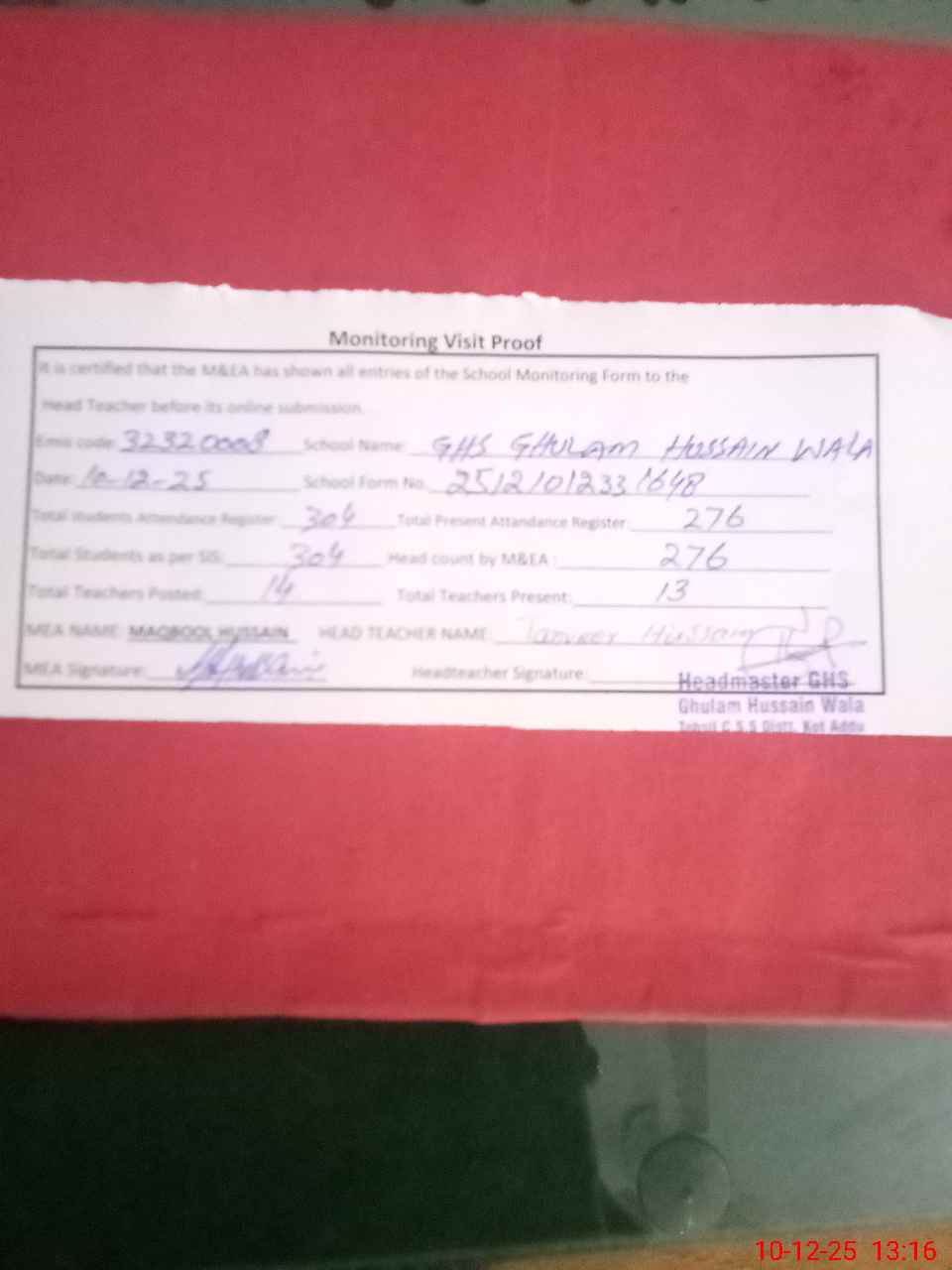 | Attendance Register | Head Teacher | MEA with School | Visit Proof |