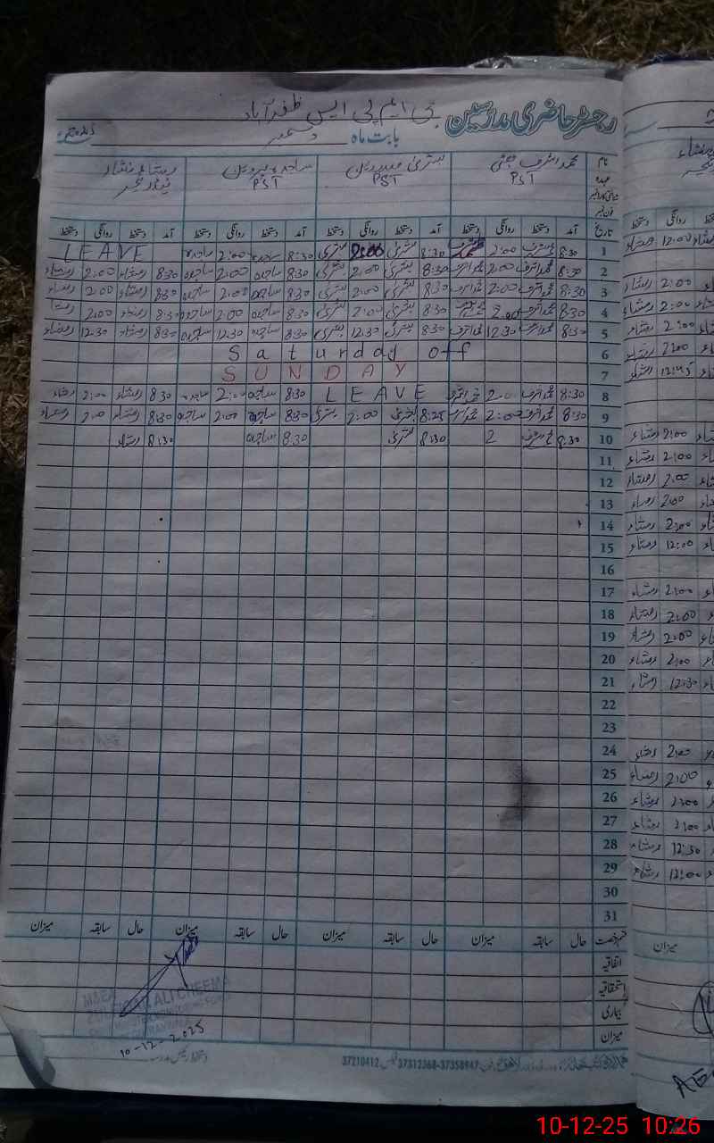 | CNIC | Full Name | Designation | R/C | Absence During Last Calender Month |