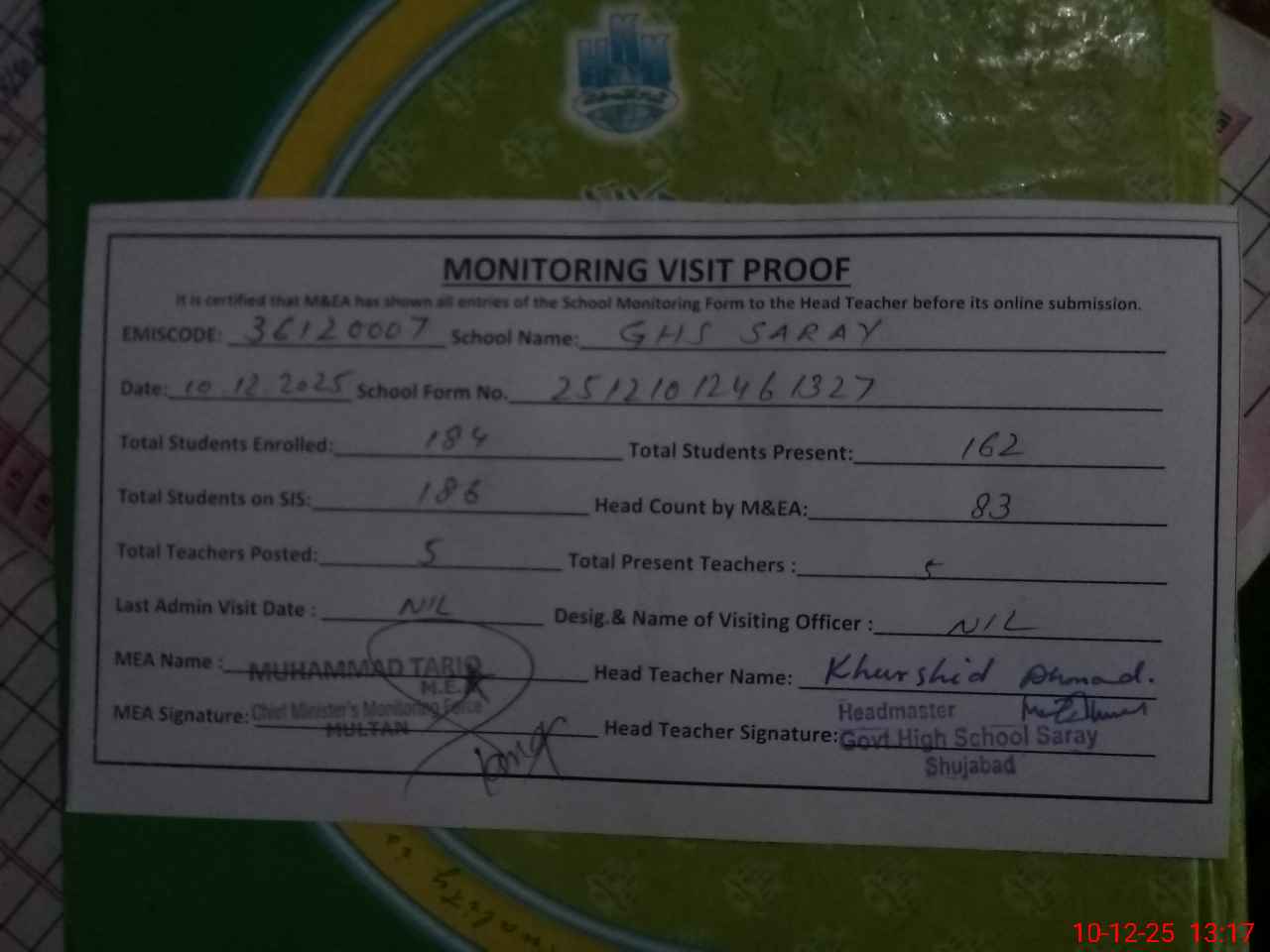 | Attendance Register | Head Teacher | MEA with School | Visit Proof |