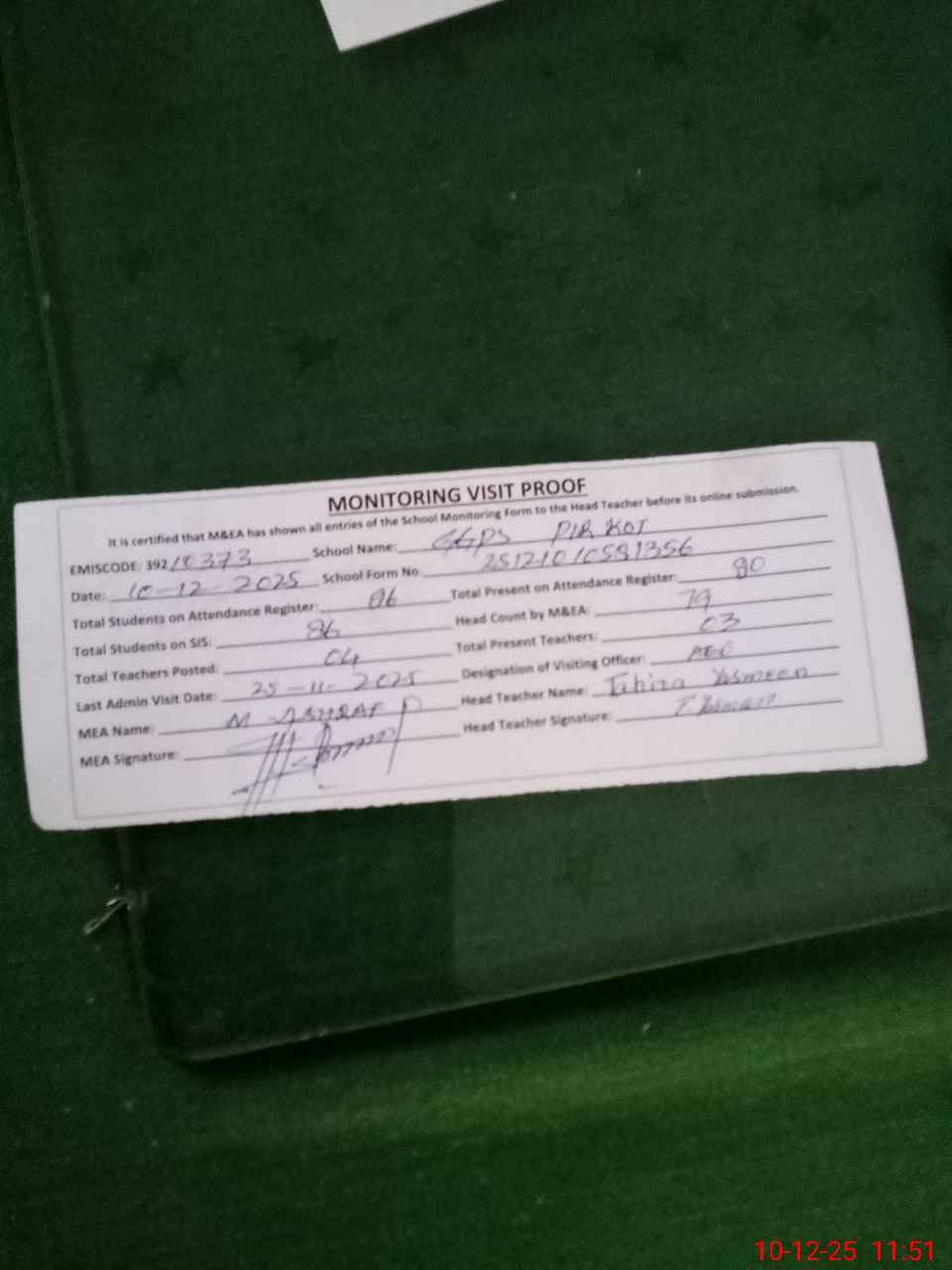 | Attendance Register | Head Teacher | MEA with School | Visit Proof |