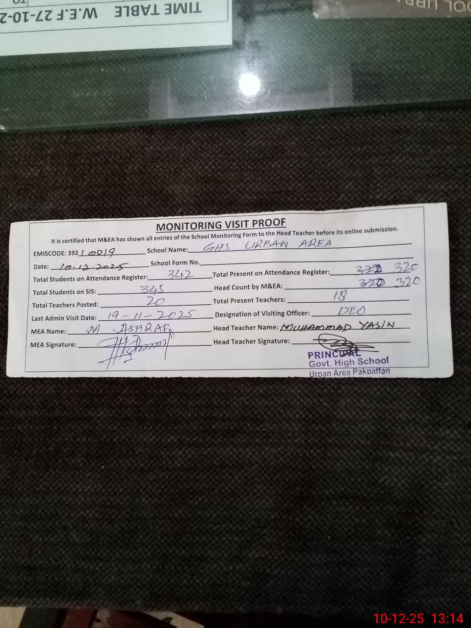 | EMIS Code: 39210019 | Name of School: GHS URBAN AREA ISLAM COLONY | |||