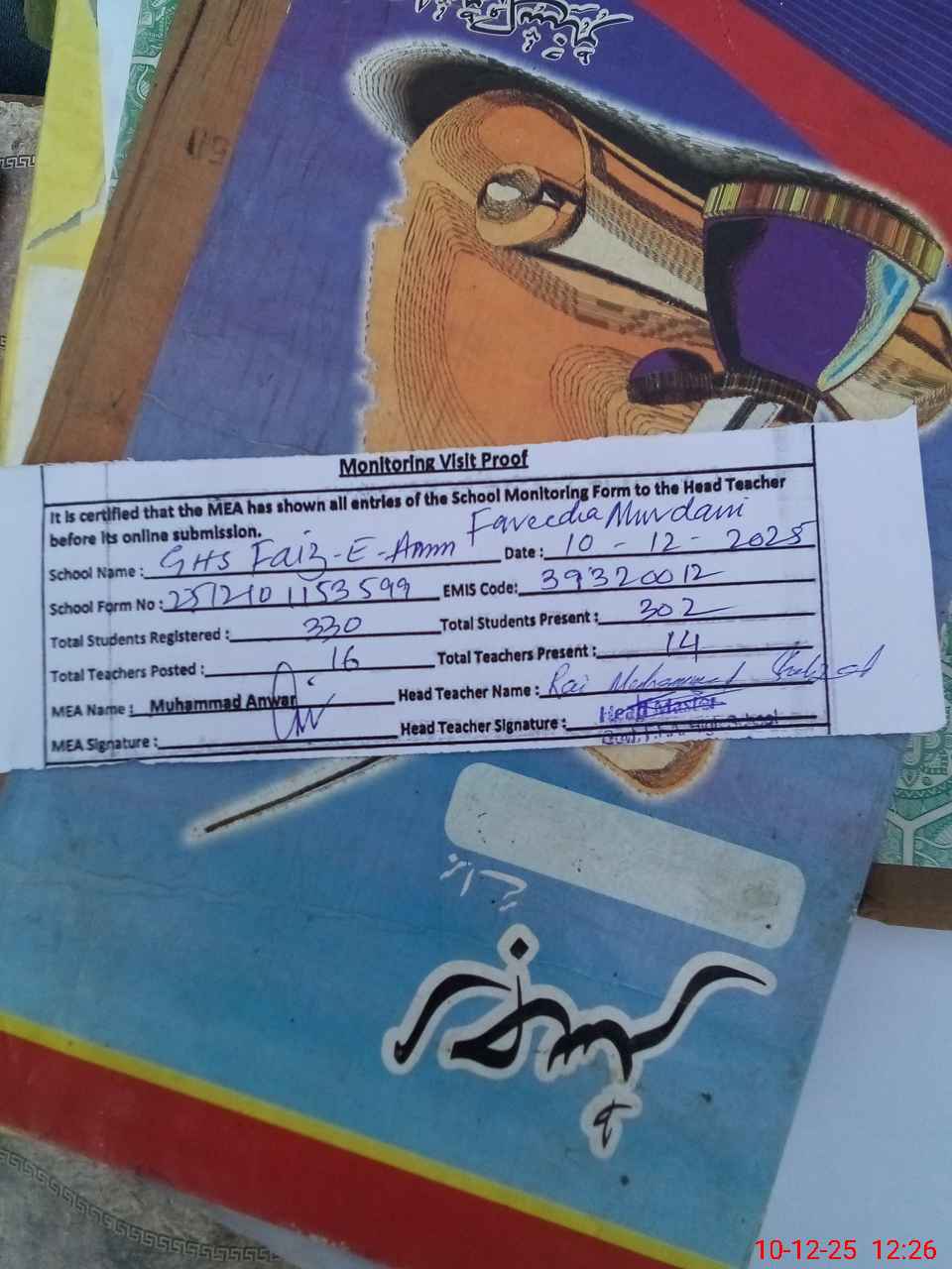 | Attendance Register | Head Teacher | MEA with School | Visit Proof |