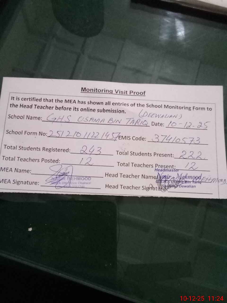 | Attendance Register | Head Teacher | MEA with School | Visit Proof |