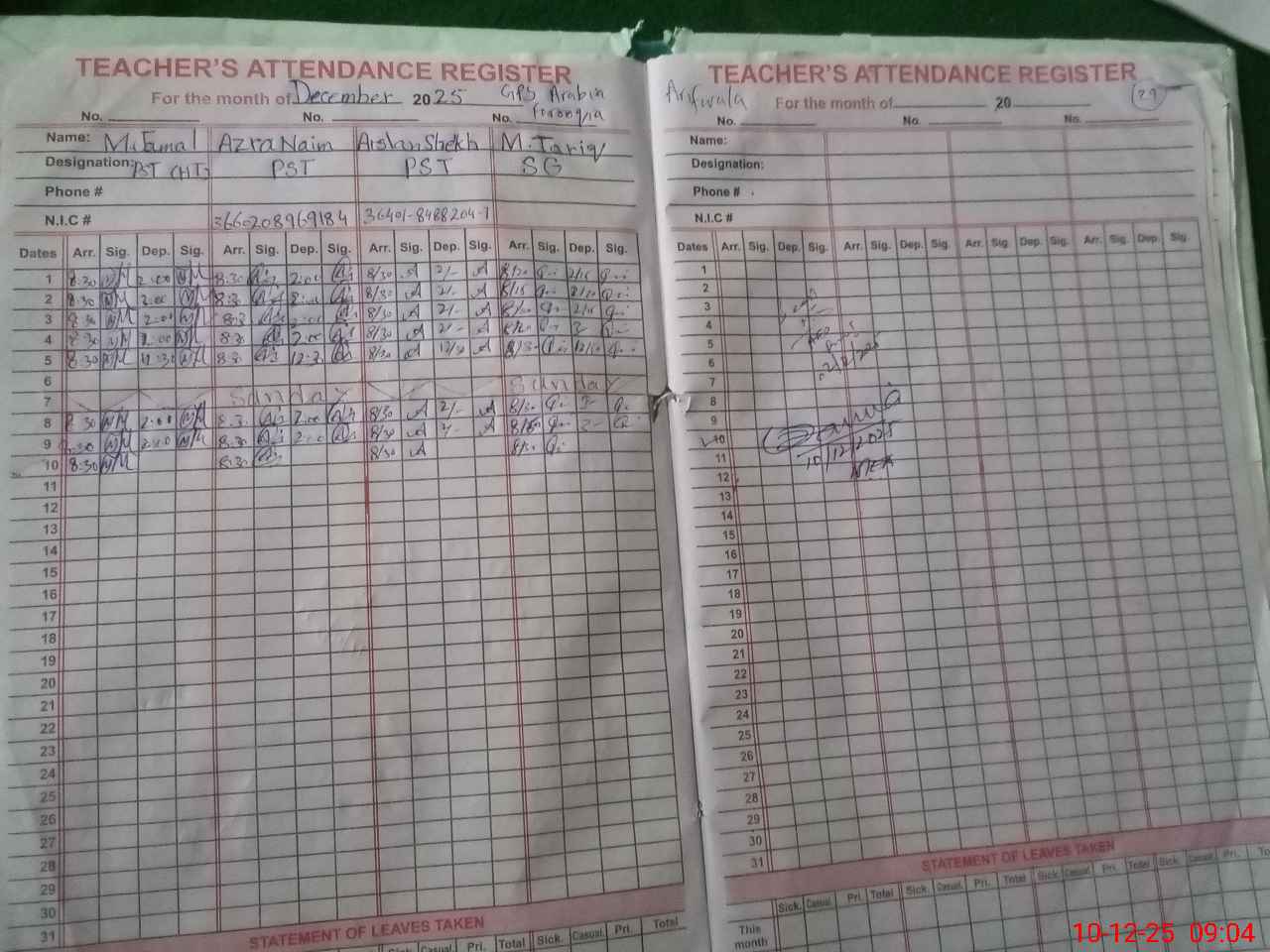 | CNIC | Full Name | Designation | R/C | Absence During Last Calender Month |