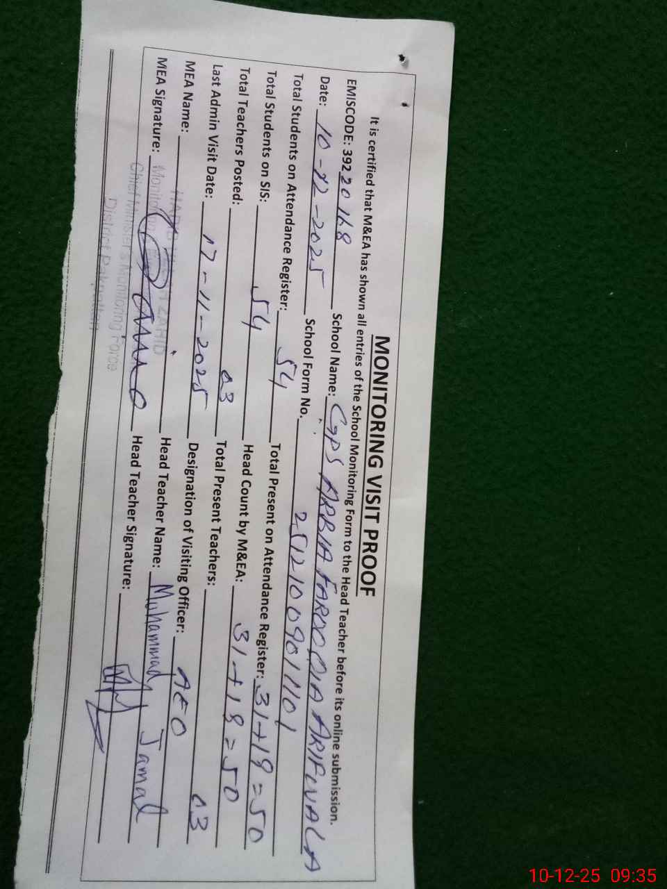 | Attendance Register | Head Teacher | MEA with School | Visit Proof |