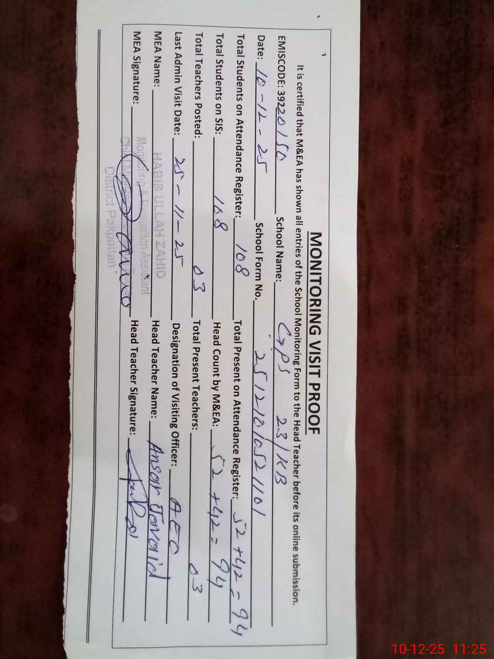 | EMIS Code: 39220150 | Name of School: GPS CHAK NO. 23 KB | |||