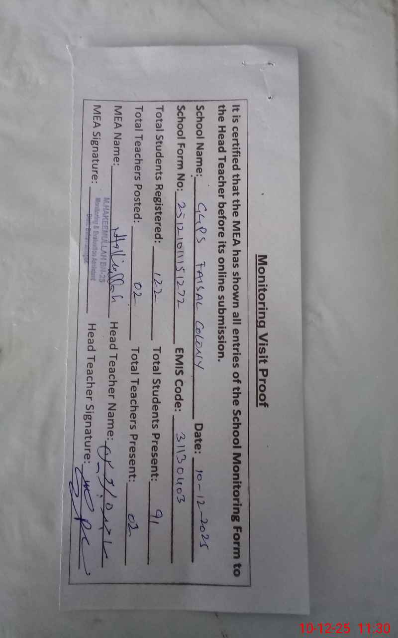 | EMIS Code: 31130403 | Name of School: GGPS FAISAL COLONY | |||