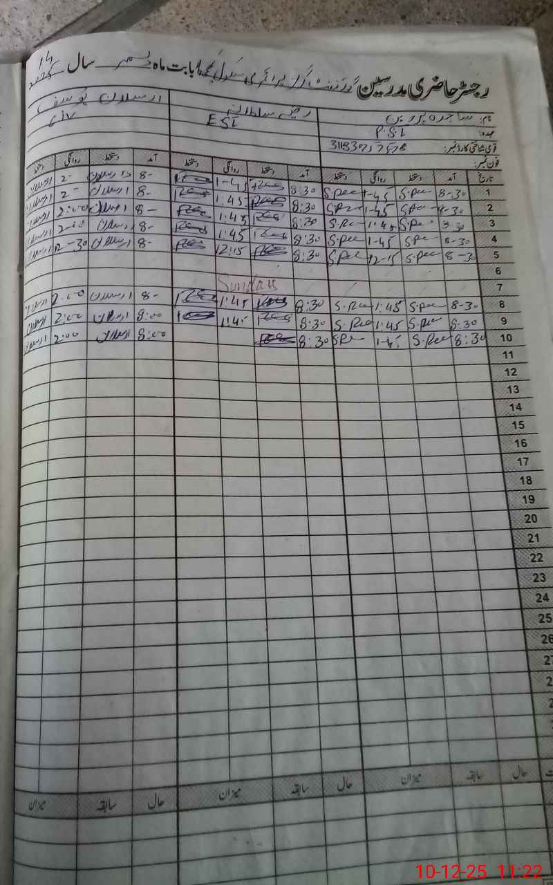 | CNIC | Full Name | Designation | R/C | Absence During Last Calender Month |