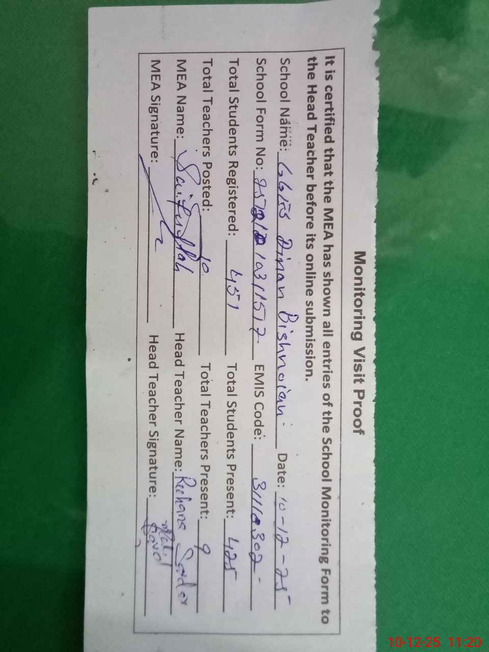 | Attendance Register | Head Teacher | MEA with School | Visit Proof |