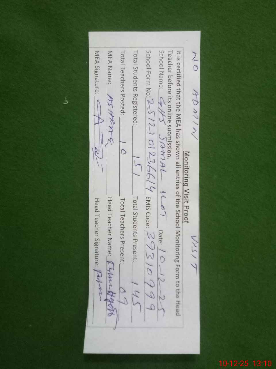 | Certified that this School was Inspected by the Undersigned MEA/DMO Today and the Information Stated Above is as Per Record. | |||||