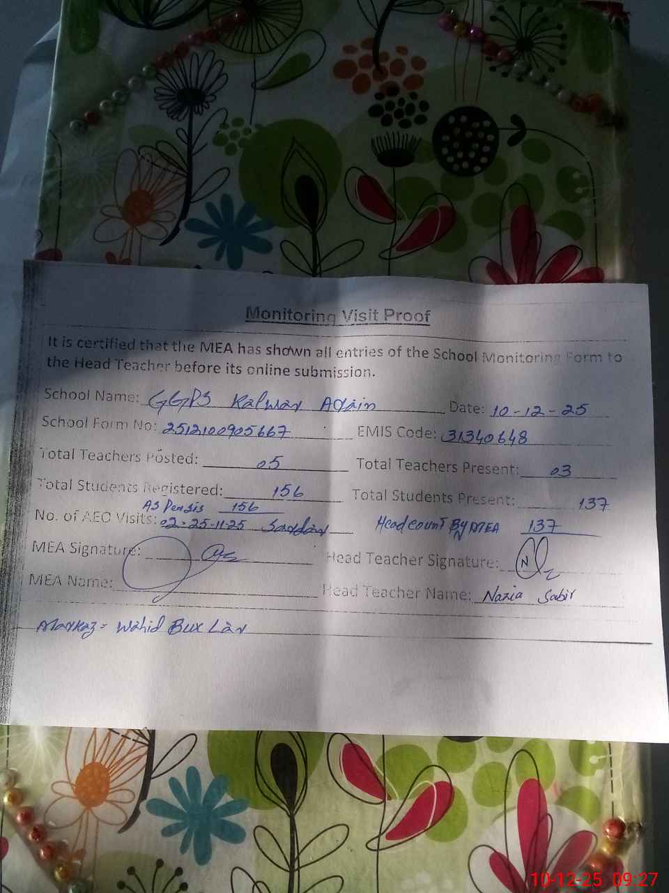 | EMIS Code: 31340648 | Name of School: GGPS KALWARA ARAIN | |||