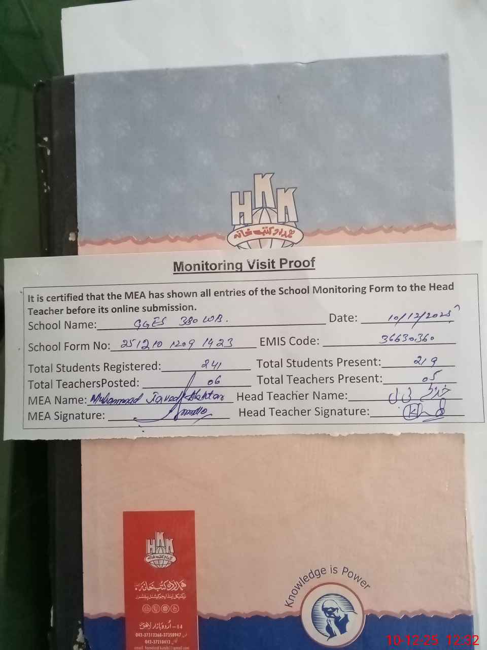 | Attendance Register | Head Teacher | MEA with School | Visit Proof |