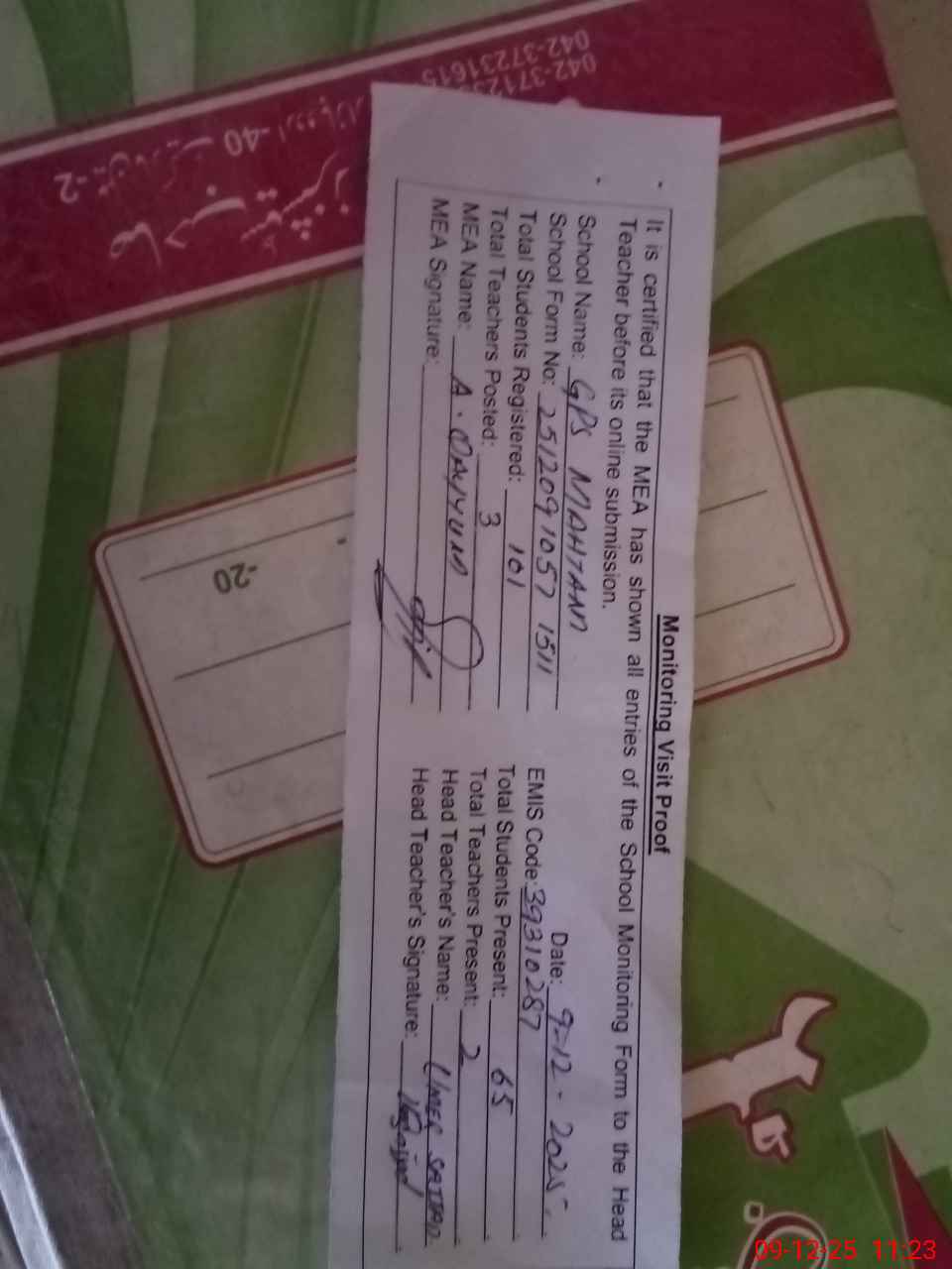 | Attendance Register | Head Teacher | MEA with School | Visit Proof |