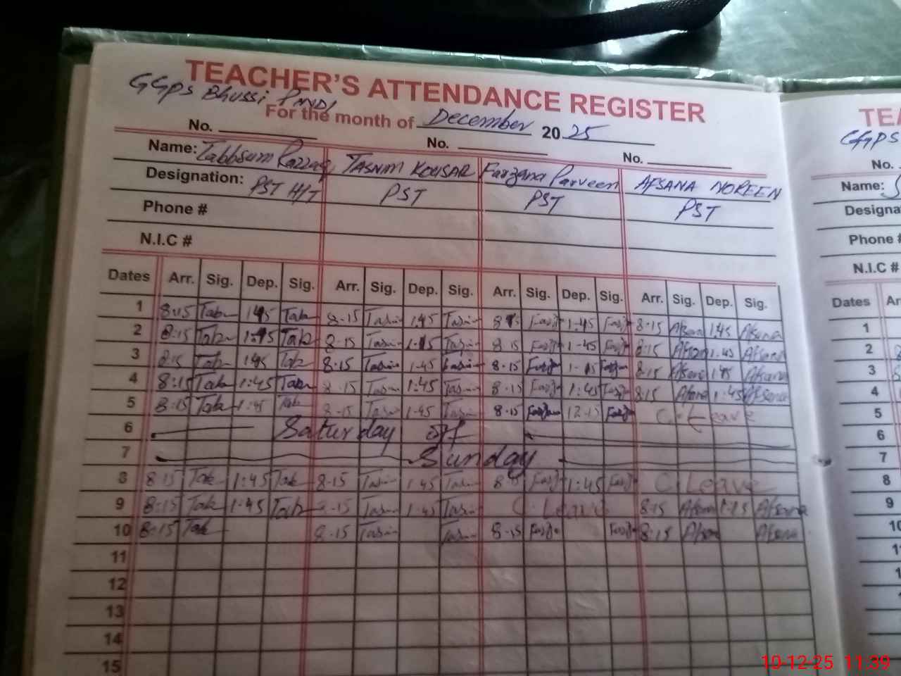 | CNIC | Full Name | Designation | R/C | Absence During Last Calender Month |