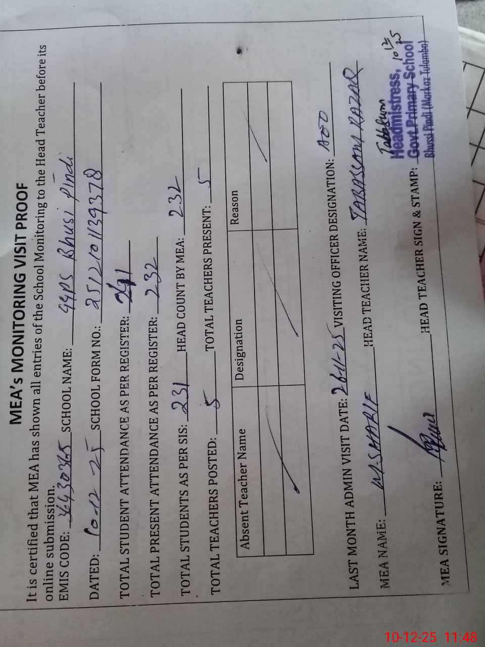 | Attendance Register | Head Teacher | MEA with School | Visit Proof |