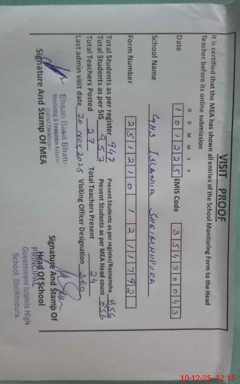 | EMIS Code: 35430043 | Name of School: GHS ISLAMIA SHEIKHUPURA | |||