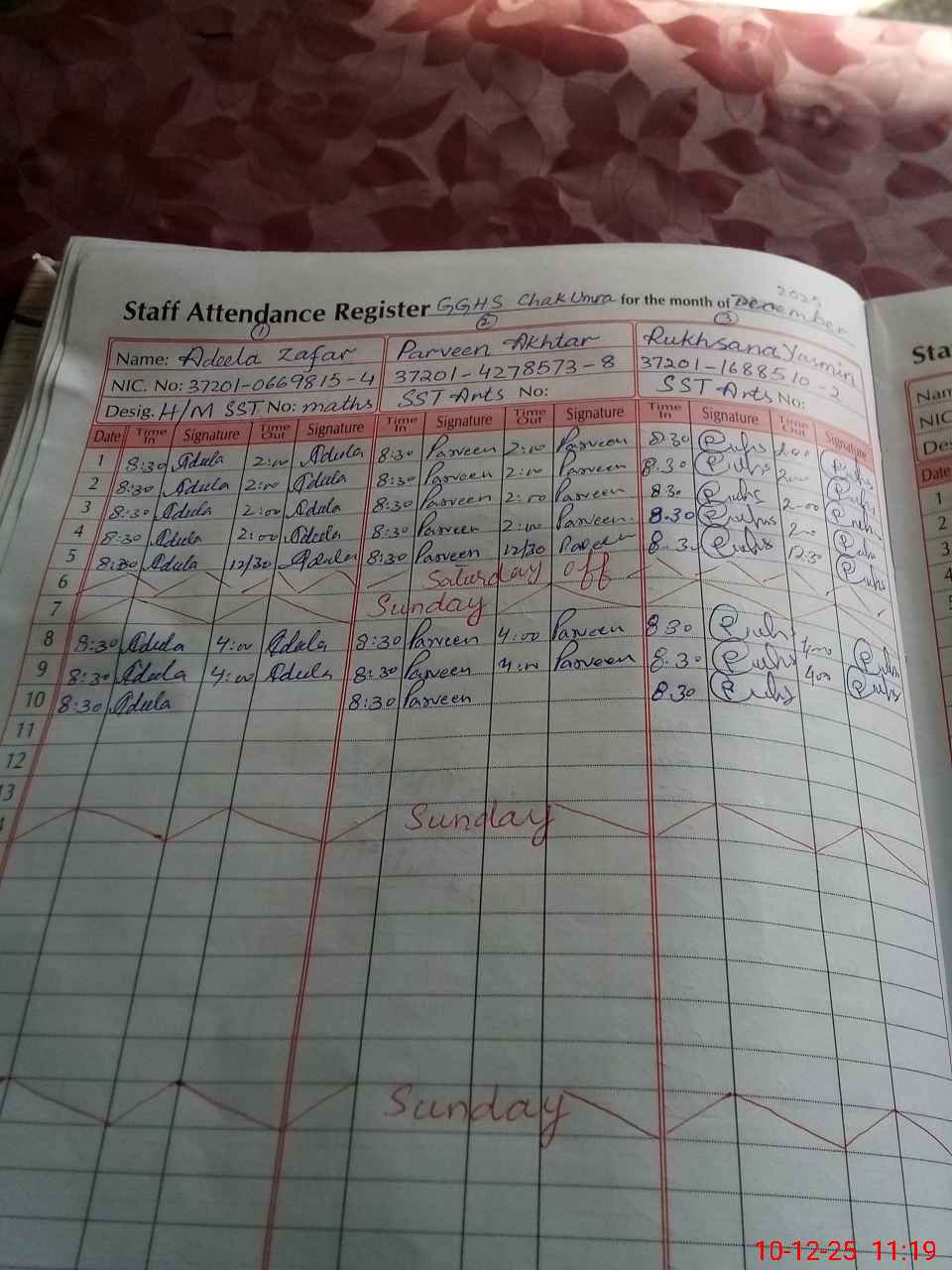 | CNIC | Full Name | Designation | R/C | Absence during last cal. month |