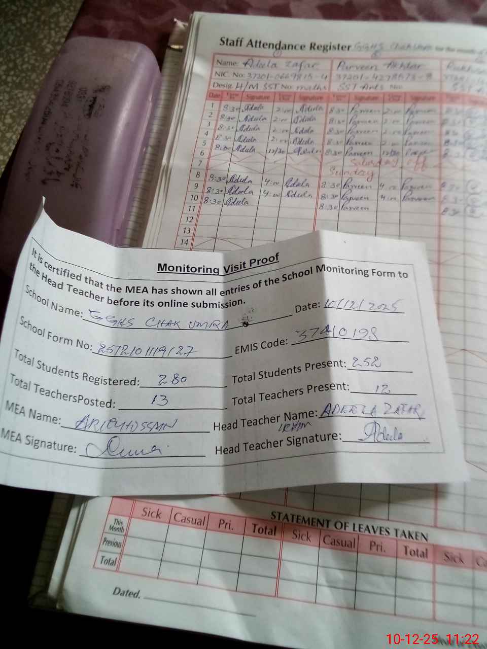| Attendance Register | Head Teacher | MEA with School | Visit Proof |