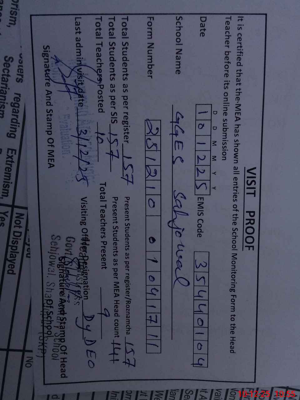 | Certified that this School was Inspected by the Undersigned MEA/DMO Today and the Information Stated Above is as Per Record. | |||||