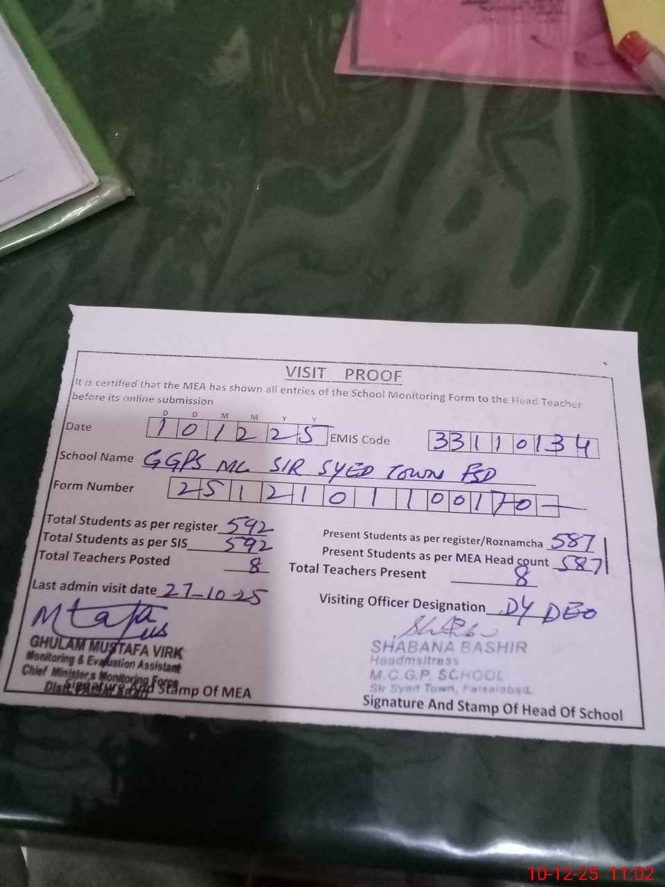 | EMIS Code: 33110134 | Name of School: GGES MC SIR SYED TOWN FSD | |||