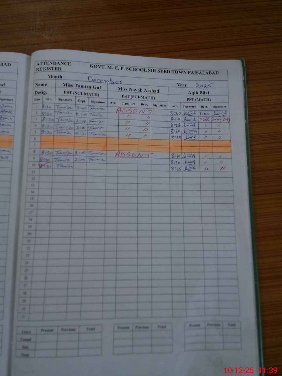 | 34**** | Na**** Ar**** | PST Science/Maths | Regular | 0 | 0 | 0 | 0 | 0 | 0 | 0 | 0 | 0 | Absent (Un-Authorized) |