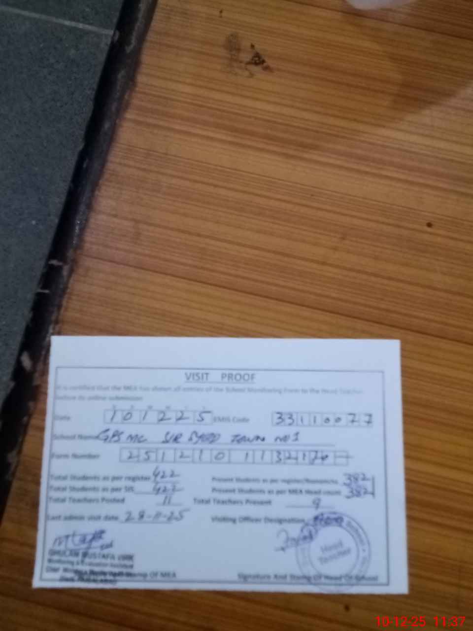 | Attendance Register | Head Teacher | MEA with School | Visit Proof |