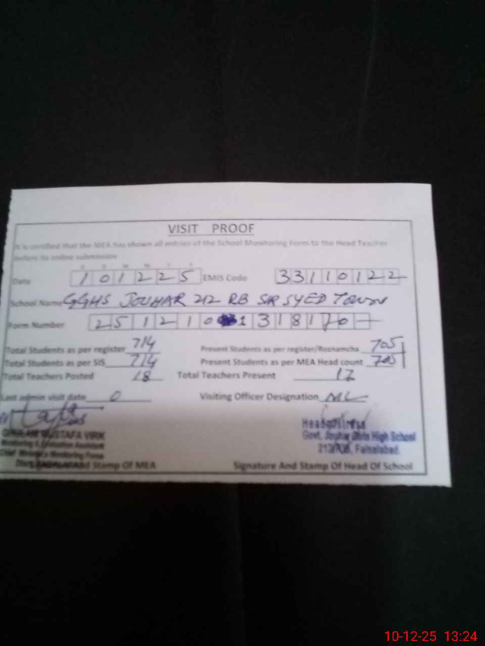 | Certified that this School was Inspected by the Undersigned MEA/DMO Today and the Information Stated Above is as Per Record. | |||||