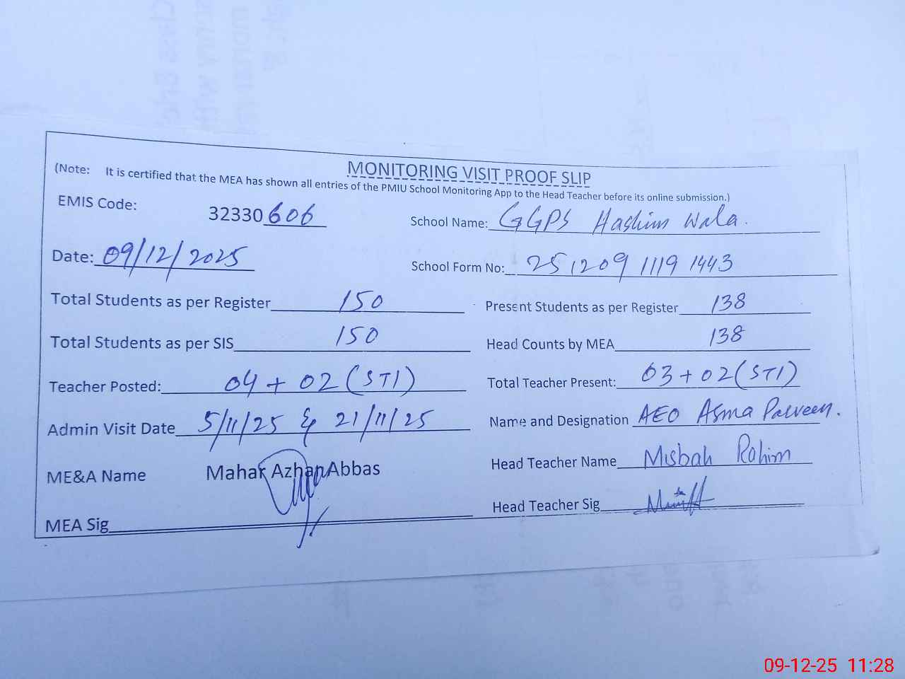 | Attendance Register | Head Teacher | MEA with School | Visit Proof |