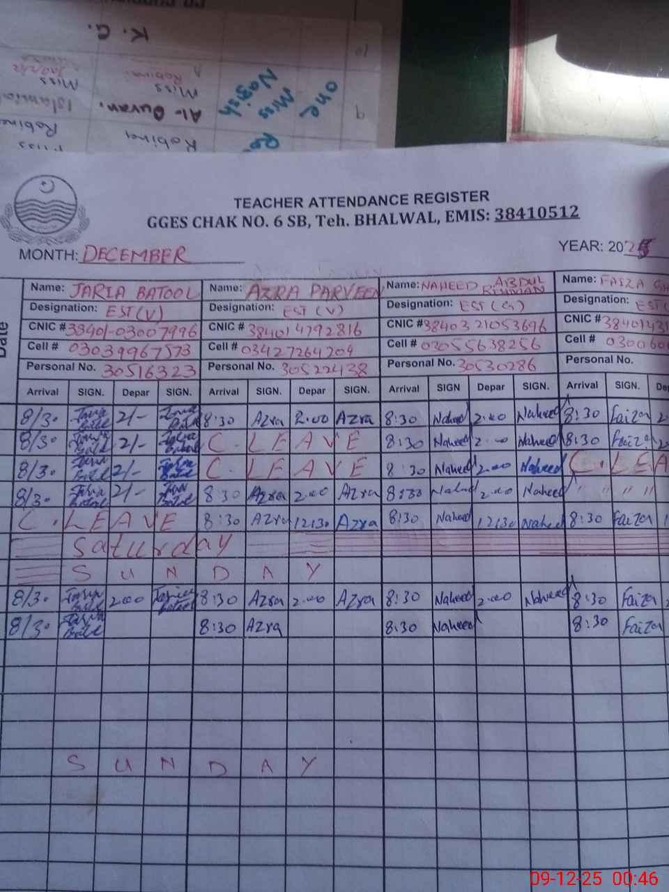 | CNIC | Full Name | Designation | R/C | Absence during last cal. month |