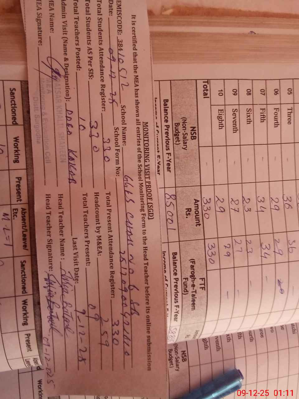 | Attendance Register | Head Teacher | MEA with School | Visit Proof |