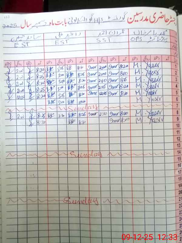 | CNIC | Full Name | Designation | R/C | Absence During Last Calender Month |