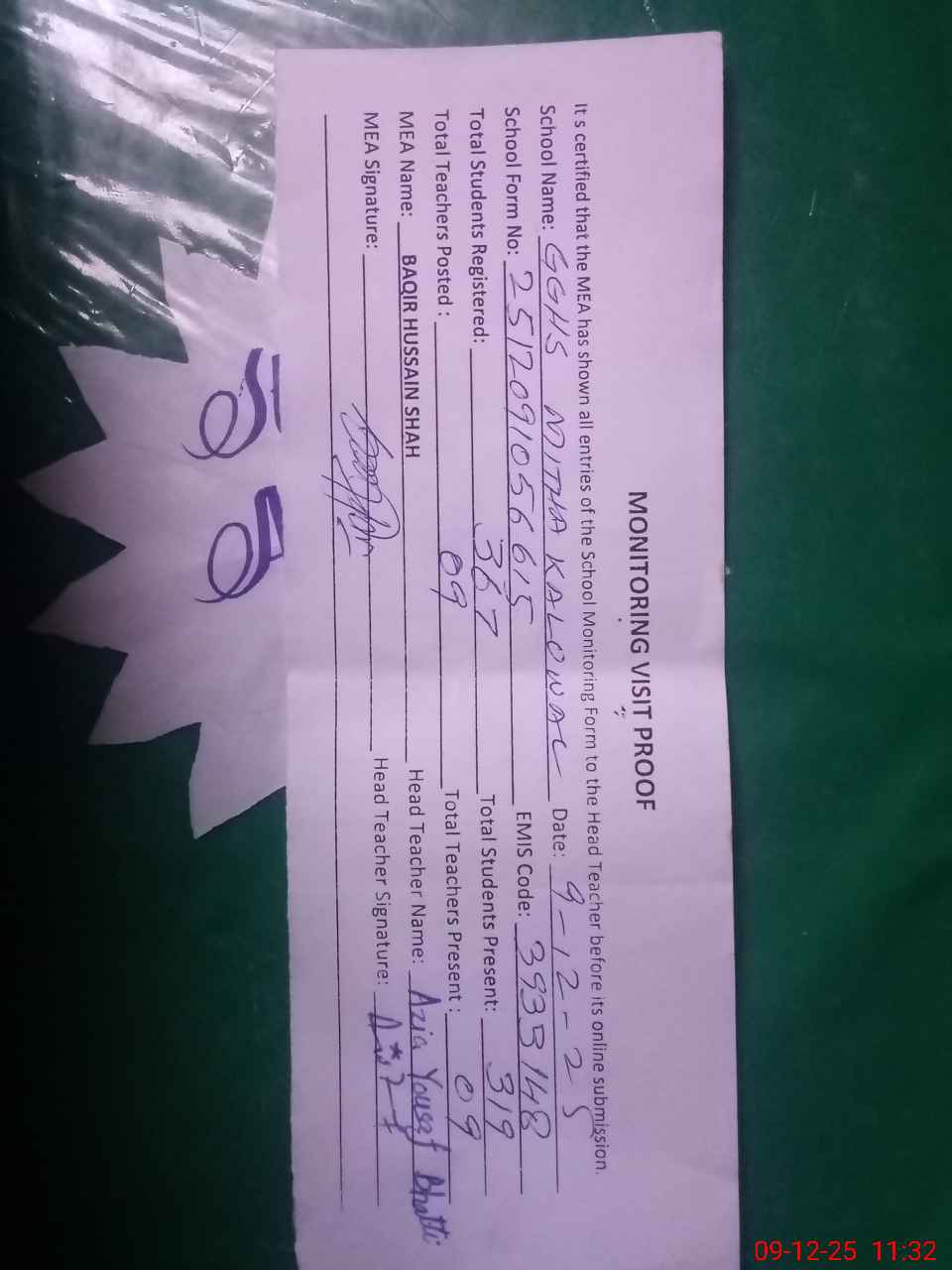 | Attendance Register | Head Teacher | MEA with School | Visit Proof |