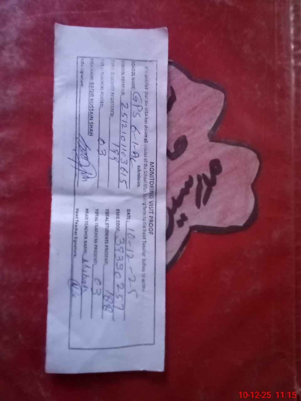 | Attendance Register | Head Teacher | MEA with School | Visit Proof |