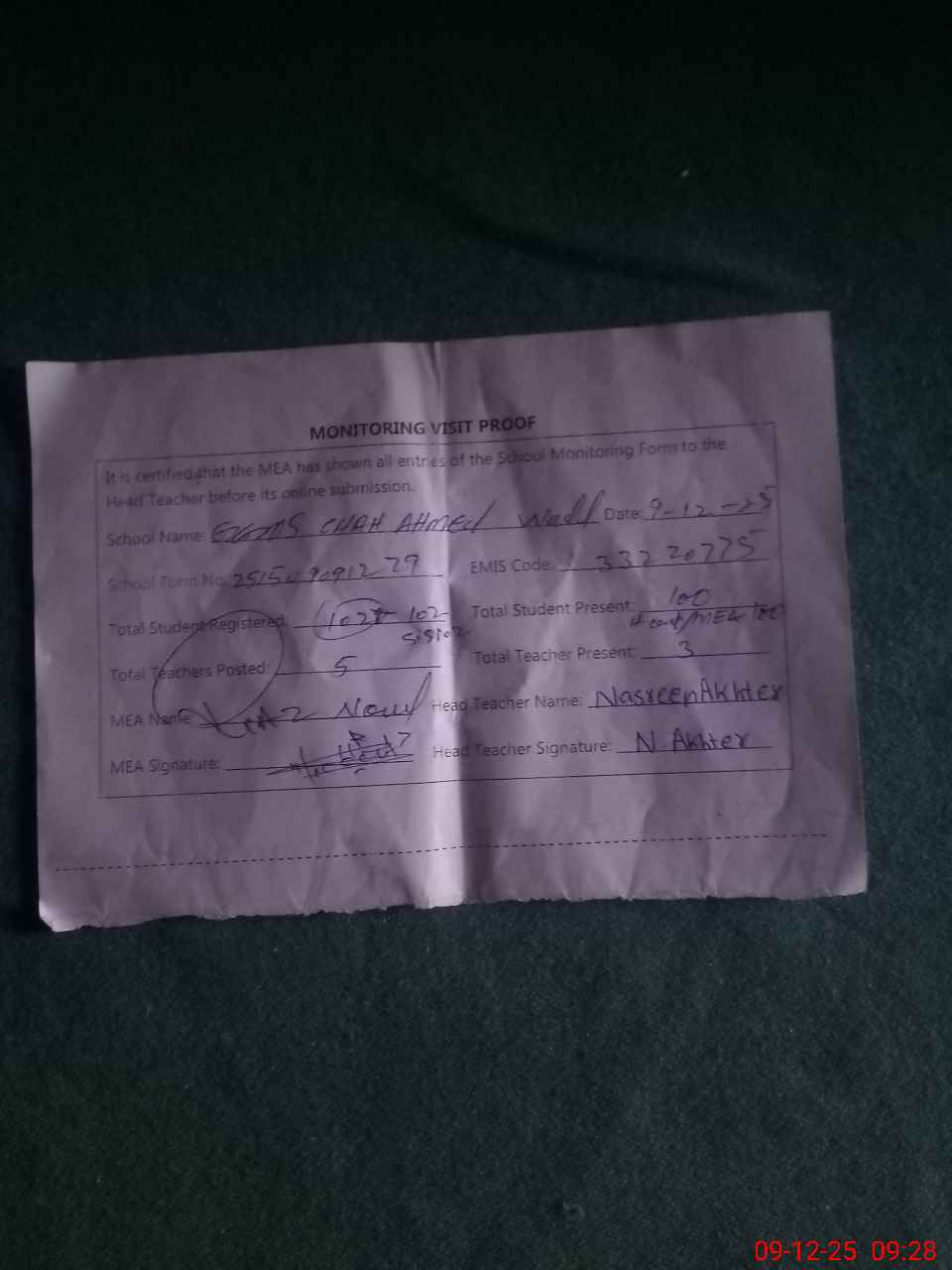 | Attendance Register | Head Teacher | MEA with School | Visit Proof |