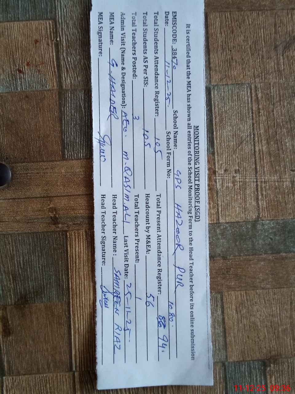 | Attendance Register | Head Teacher | MEA with School | Visit Proof |
