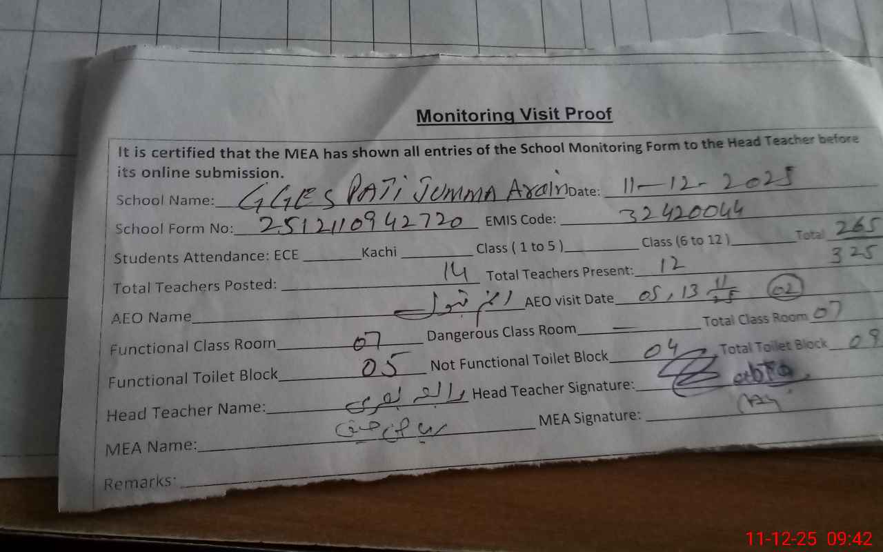 | EMIS Code: 32420044 | Name of School: GGES PATI JUMMA ARAIN | |||