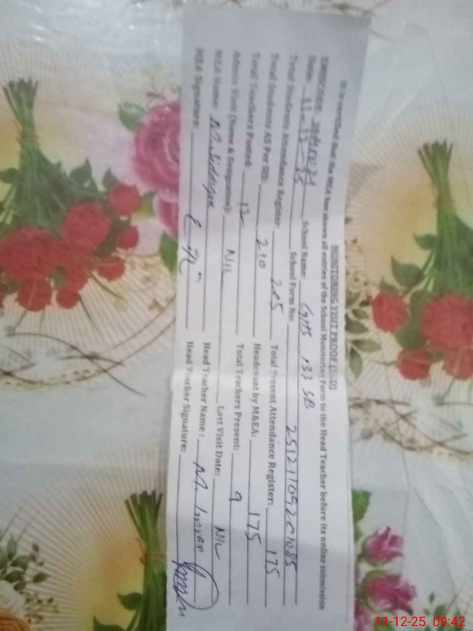 | Attendance Register | Head Teacher | MEA with School | Visit Proof |