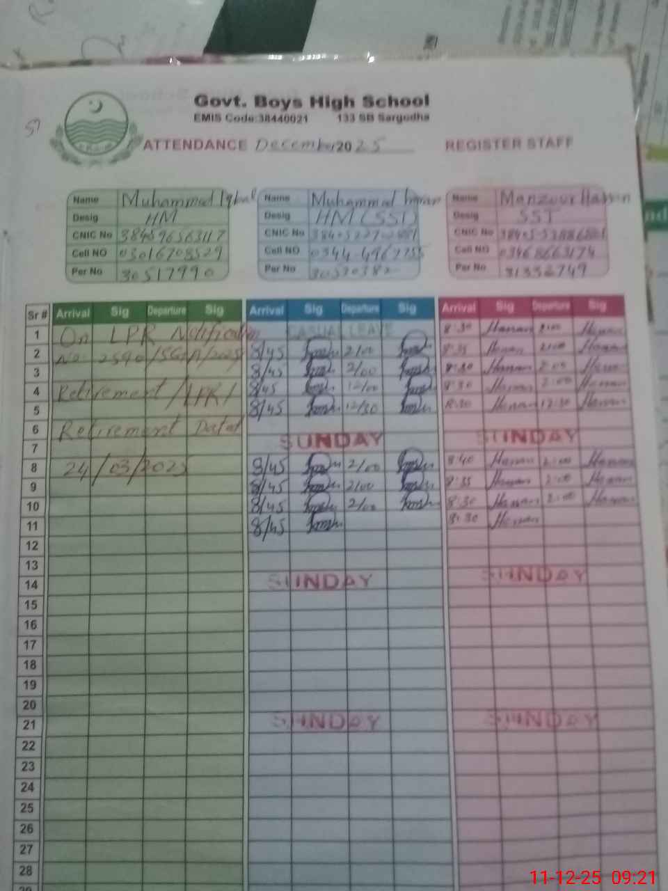 | CNIC | Full Name | Designation | R/C | Absence during last cal. month |