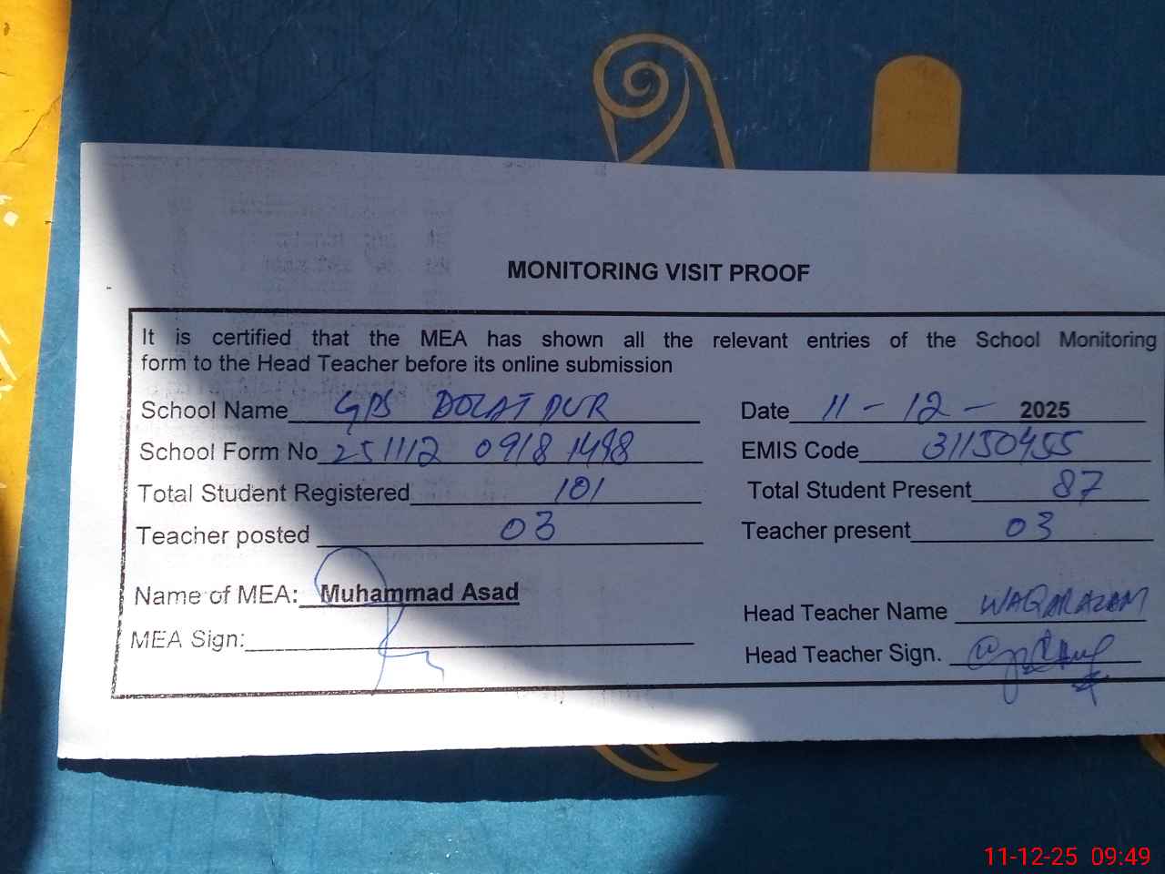 | Attendance Register | Head Teacher | MEA with School | Visit Proof |