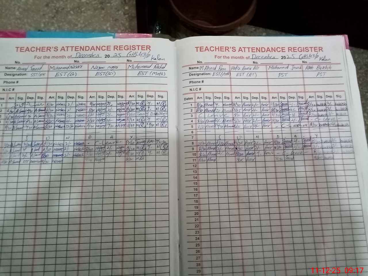 | CNIC | Full Name | Designation | R/C | Absence during last cal. month |