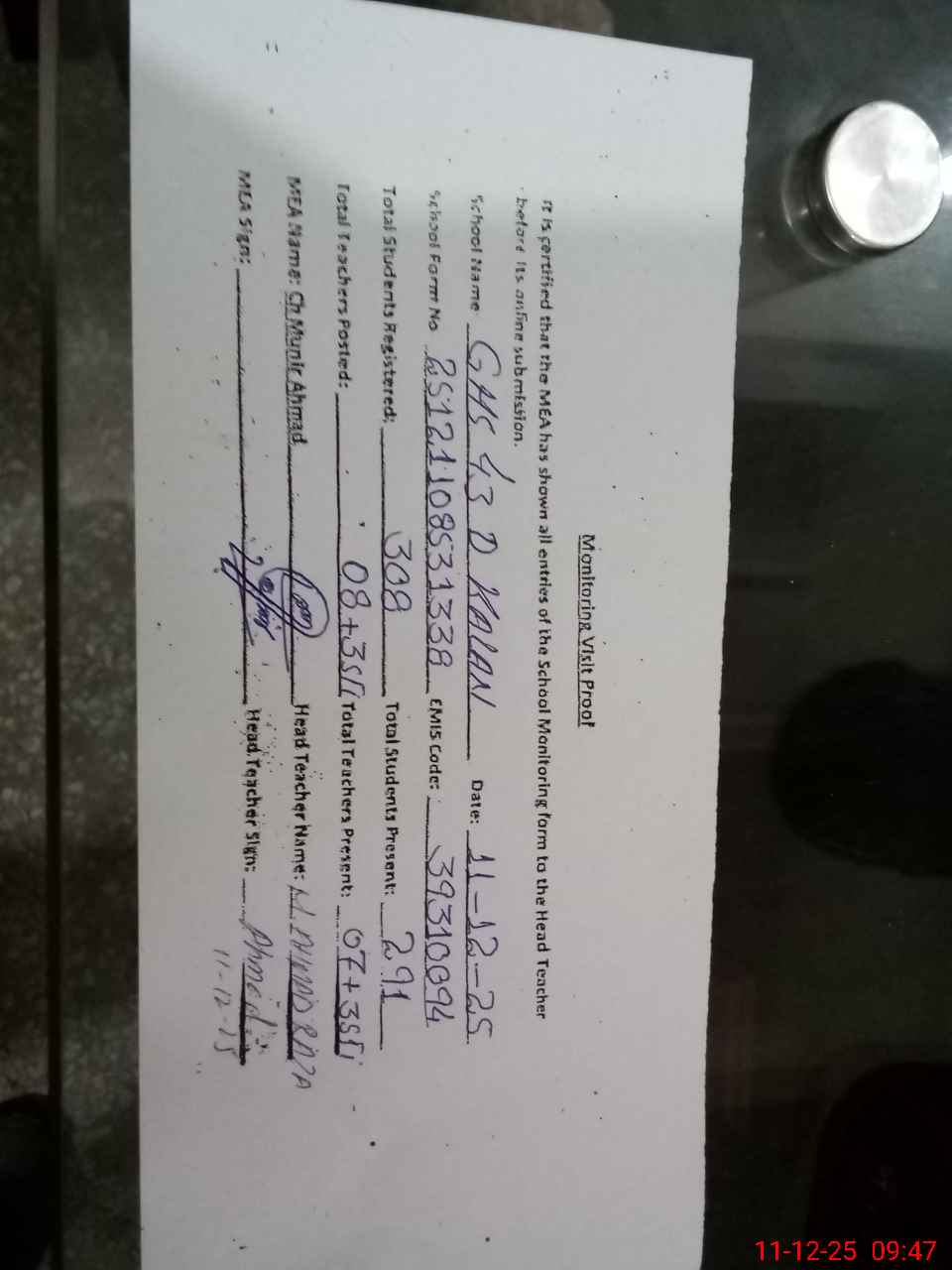 | Attendance Register | Head Teacher | MEA with School | Visit Proof |