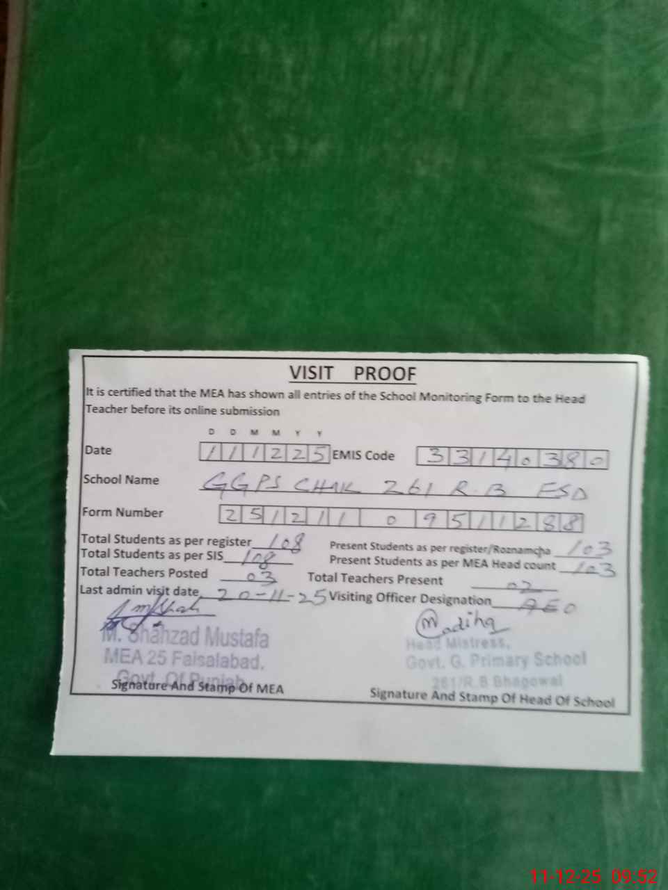 | Attendance Register | Head Teacher | MEA with School | Visit Proof |