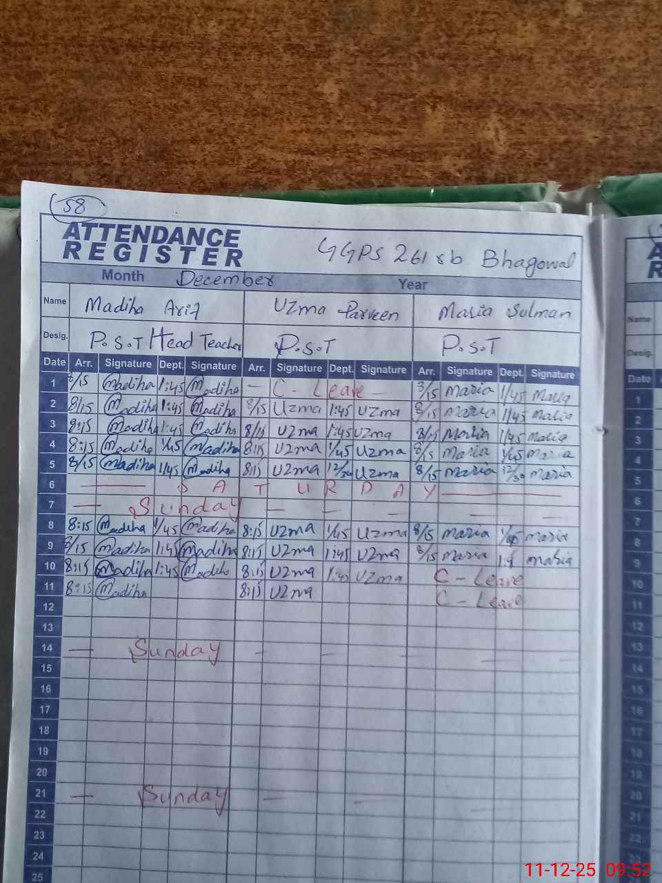 | CNIC | Full Name | Designation | R/C | Absence During Last Calender Month |