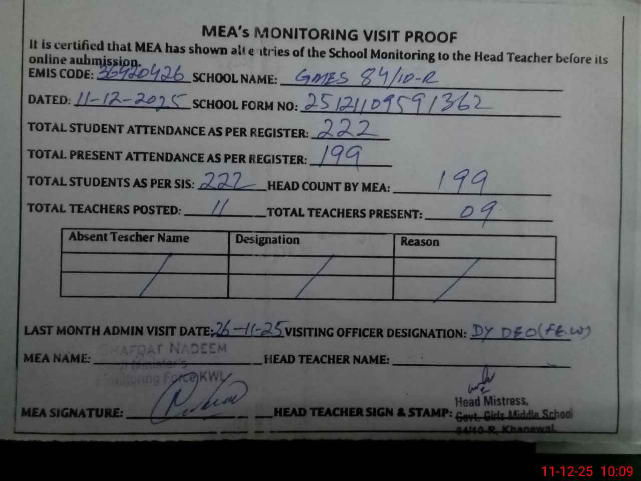| EMIS Code: 36420426 | Name of School: GMES 84/10-R, KHANEWAL | |||